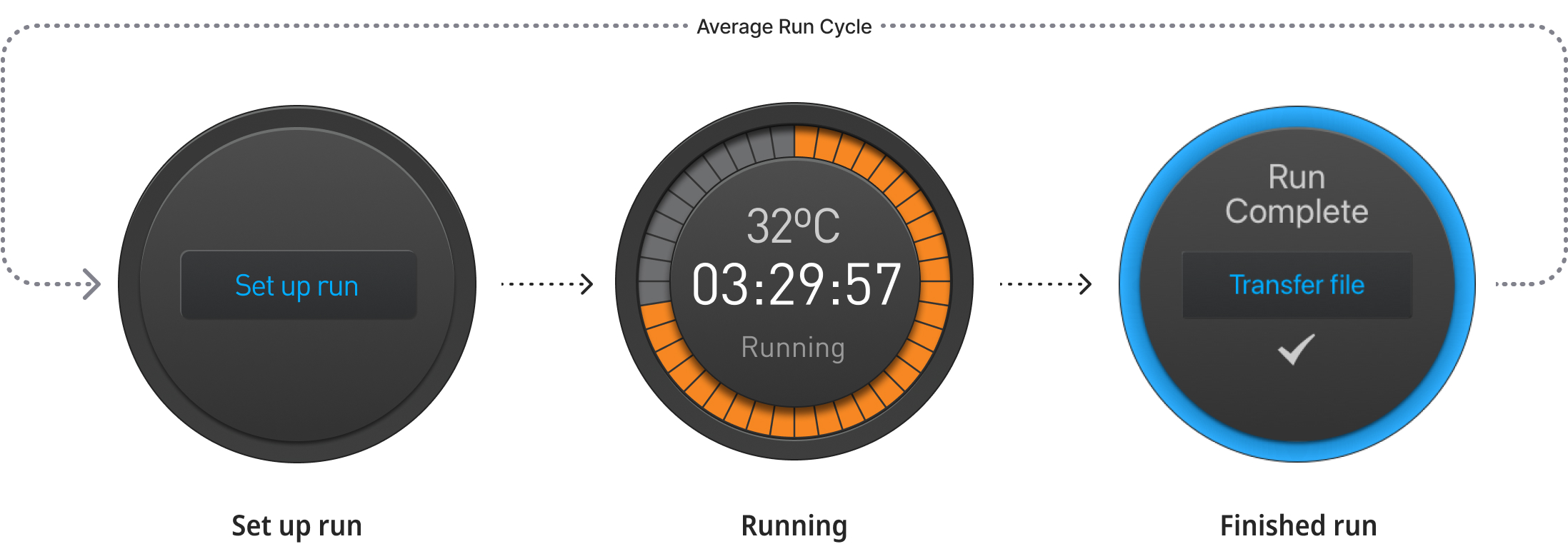 A common observation in labs filled with various instruments was the inconsistency in screen layouts. How could we unify these screens despite their different work states? The key would be to deeply understand the core workflow. At a high level, the workflow consisted of three main parts: Setting up the run, performing the run, and finishing the run. This high-level perspective led us to conceptualize a specifici design component that could represent each state of a flow: an empty state, a filled state, and then back to another empty state. This line of thinking led to the creation of the dial.