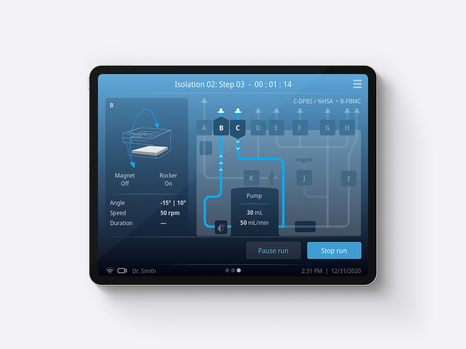 What made this instrument unique was the need for automation to reduce manual handling and errors, while also being flexible enough to support various cell therapy workflows. Scientists needed the ability to prototype custom “recipes” for different protocols. The setting up of these protocols needs to be easy, so gaining an understanding of the user needs was the first place to begin. What parameters make up a specific protocol? Once that's understood, I could then visualize a screen that gives them control of everything. In this case, they needed to control a "magnet", "rocker", and "tube sites" (which tubes push liquid where).