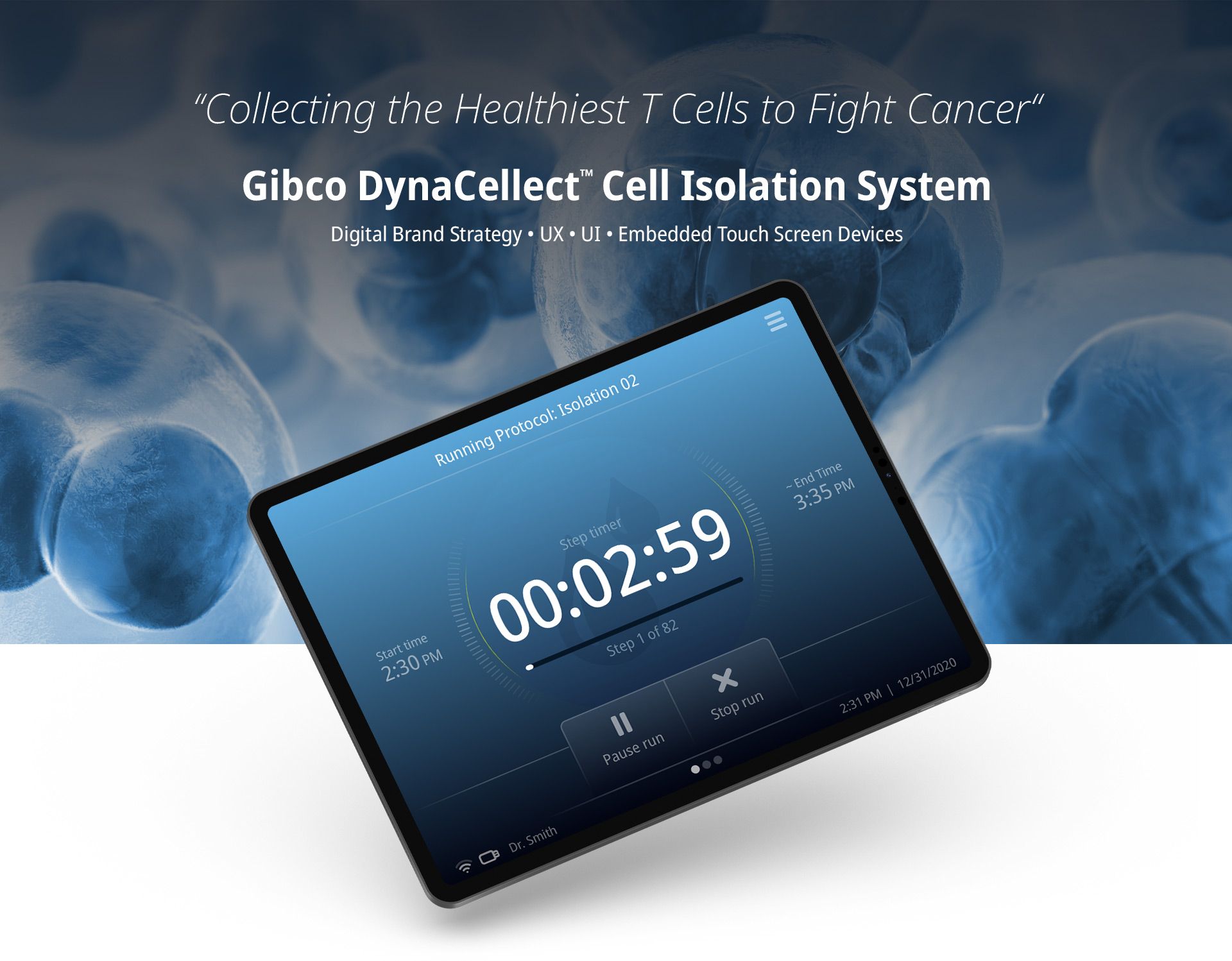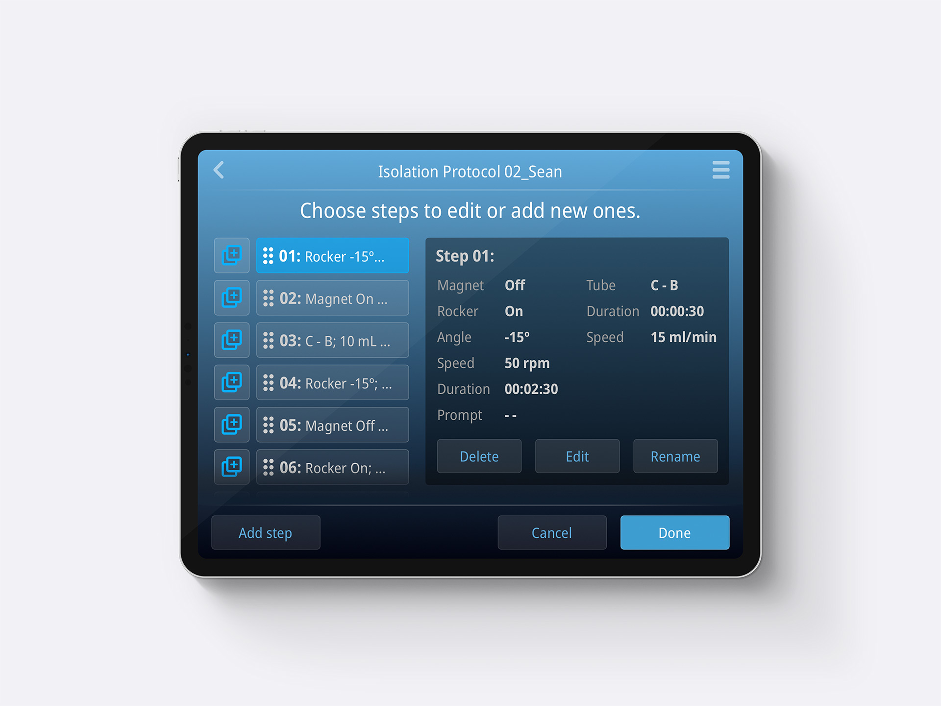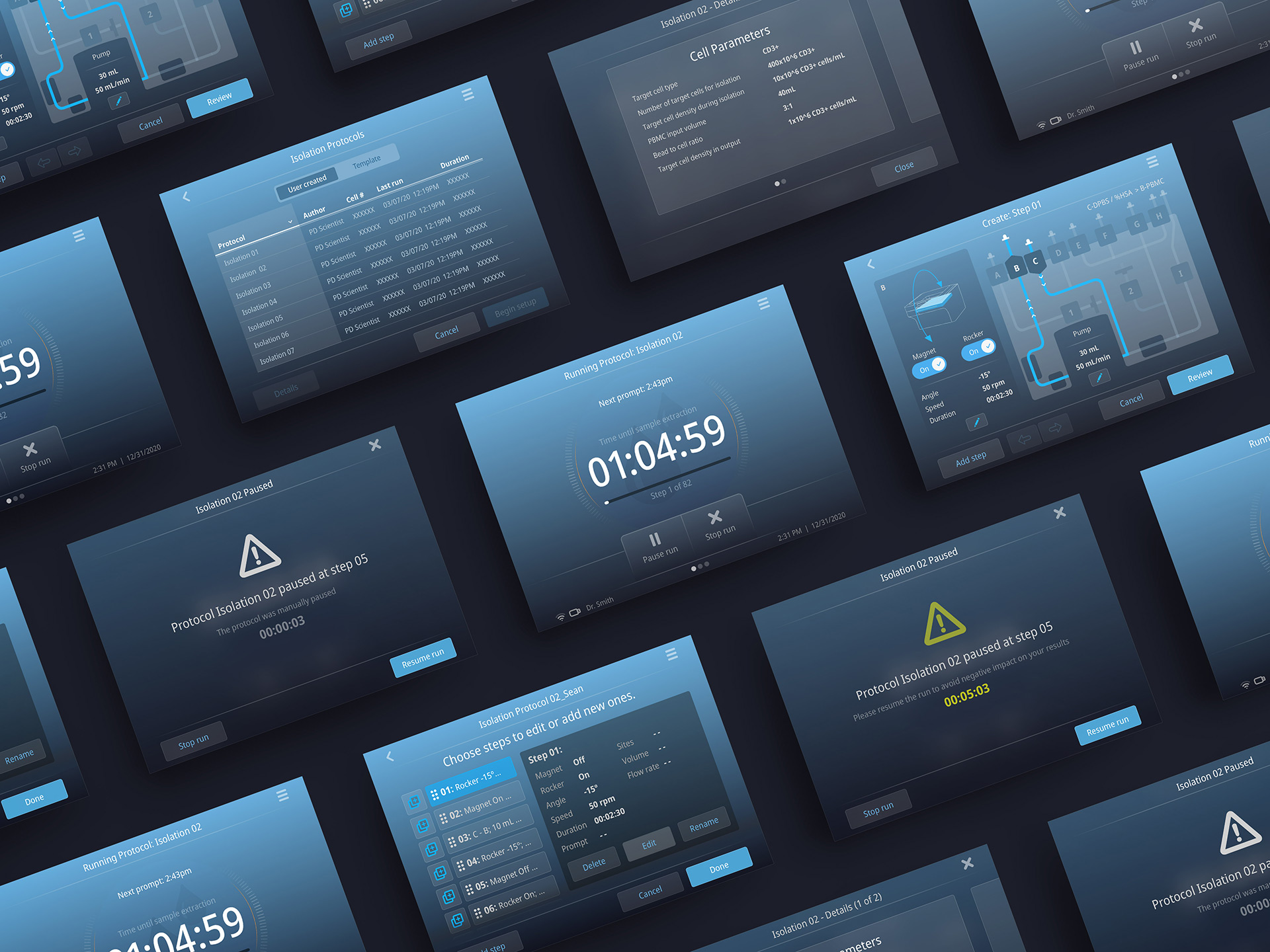 What made this instrument unique was the need for automation to reduce manual handling and errors, while also being flexible enough to support various cell therapy workflows. Scientists needed the ability to prototype custom “recipes” for different protocols. The setting up of these protocols needs to be easy, so gaining an understanding of the user needs was the first place to begin. What parameters make up a specific protocol? Once that's understood, I could then visualize a screen that gives them control of everything. In this case, they needed to control a "magnet", "rocker", and "tube sites" (which tubes push liquid where).