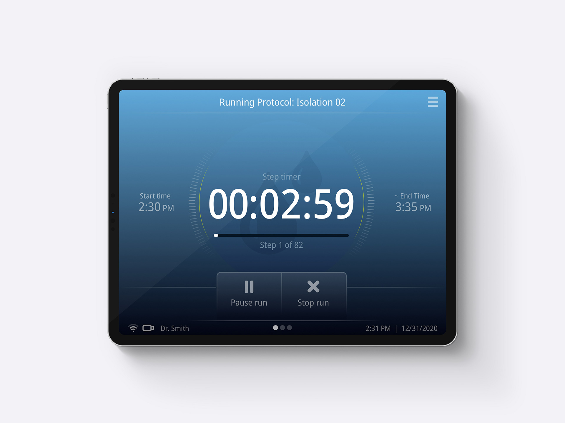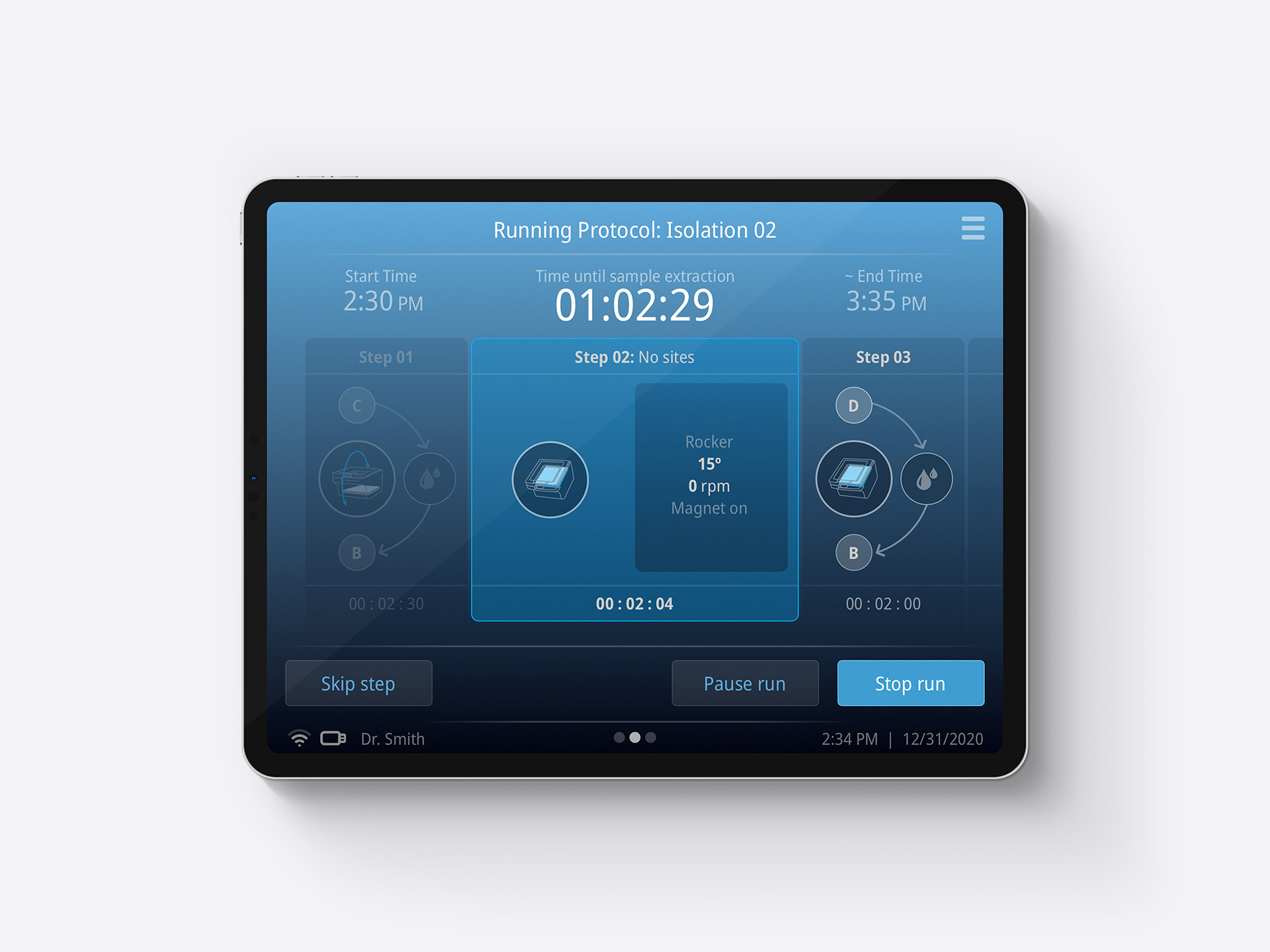 The homepage displays the remaining run time and the current step being executed. Swiping reveals a second screen with an illustration of the step-by-step process, allowing scientists to view the previous, current, and upcoming steps at a glance. Finally, a third screen shows the active tubes moving liquid through the system, as well as the rocker position and magnet.