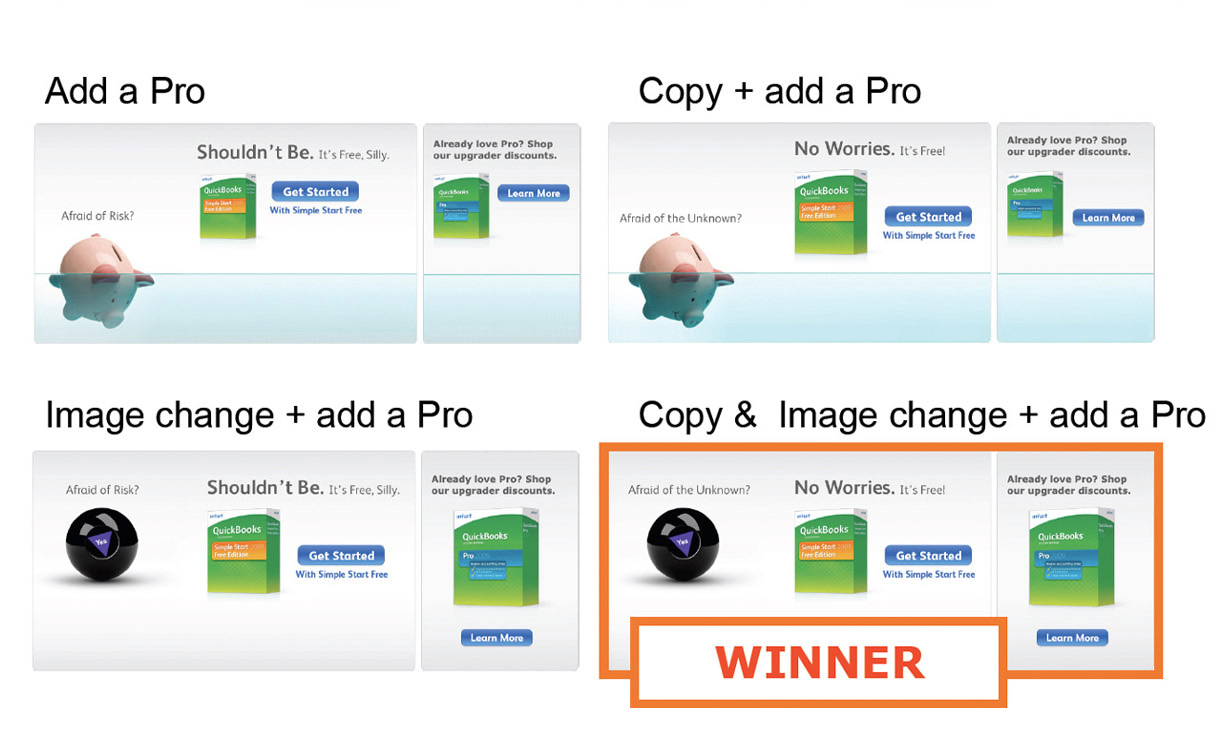While at Intuit, research and usability became the norm for everything we did. Designers worked hand-in-hand with this team, and QuickBooks.com was no exception. We looked to not just do simple A/B tests to move the bar. We ventured into the world of multivariate testing. Multivariate testing is a form of experimentation wherein multiple elements of a webpage are modified and tested to determine which combination of the page leads to the maximum positive impact on conversion.